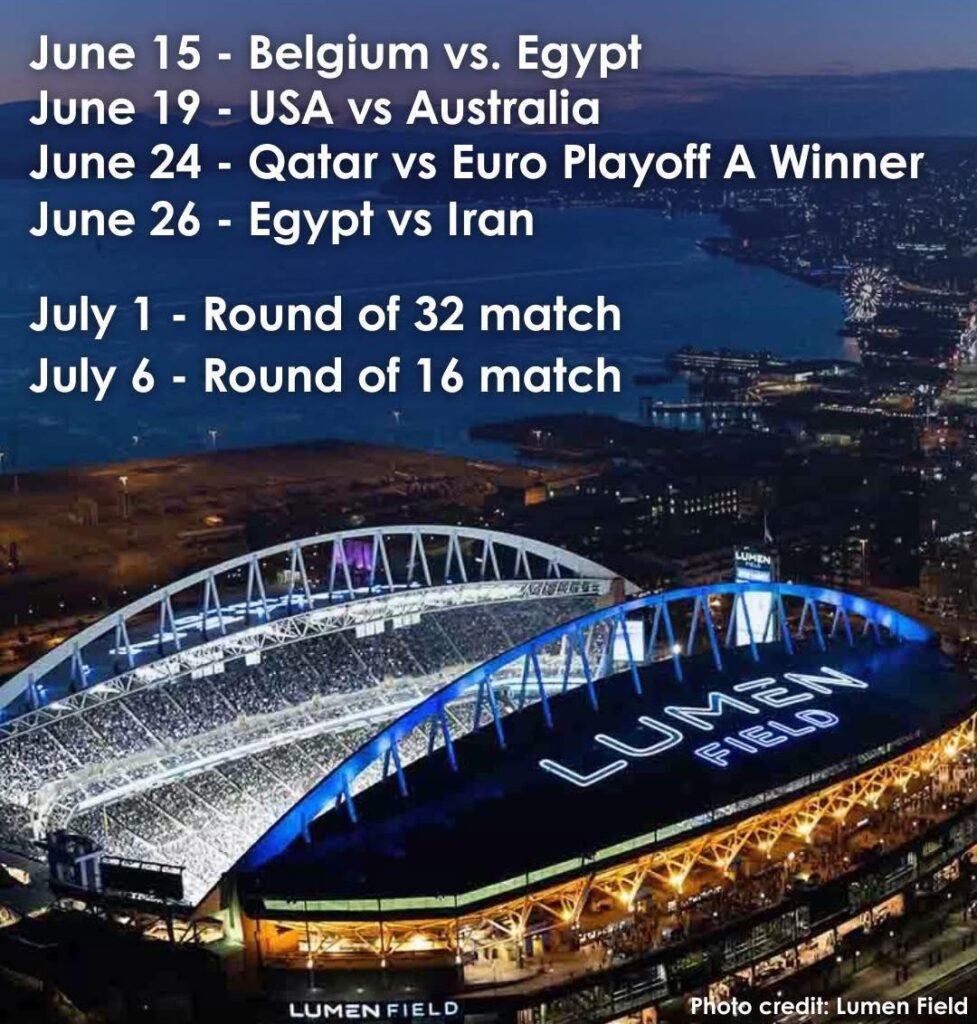 The schedule for Seattle’s World Cup soccer matches was announced on Dec. 6. The first three matches set for Lumen Field will kick off at noon (PDT) on June 15 (Belgium v. Egypt), June 19 (USA v. Australia), and June 24 (Qatar v. Euro Playoff A Winner), with the fourth match (Egpyt v. Iran) set to start at 8 p.m. on June 26. One team in the June 24 match will not be known until March when the group of four European teams compete for that spot. Two other matches will be played on July 1 (Round of 32 Match) and July 6 (Round of 16 Match). Find out more: https://www.fifa.com/en/tournaments/mens/worldcup/canadamexicousa2026